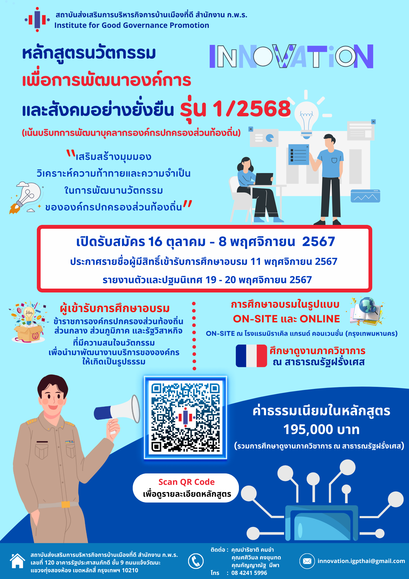 สถาบันส่งเสริมการบริหารกิจการบ้านเมืองที่ดี สำนักงาน ก.พ.ร.  (IGP) ซึ่งเป็นหน่วยบริการพิเศษภายใต้สำนักงานคณะกรรมการพัฒนาระบบราชการ (ก.พ.ร.) ตระหนักถึงความสำคัญของบุคลากรภาครัฐในทุกระดับ ที่ไม่เพียงแต่จะต้องมีความตระหนักรู้ถึงบริบทการเปลี่ยนแปลงต่าง ๆ ที่มีผลกระทบต่อนโยบาย หลักเกณฑ์ กลไกในการบริหารจัดการภาครัฐ ในบริบทต่าง ๆ  แต่หากจำเป็นอย่างยิ่งที่จะต้องเรียนรู้และพัฒนาทักษะในการสร้างนวัตกรรมภาครัฐ ทั้งเพื่อการเพิ่มประสิทธิภาพ   การทำงาน เสริมสร้างขีดความสามารถในการแข่งขัน การสร้าง ปรับปรุง และพัฒนาบริการของภาครัฐ ที่ก่อให้เกิดการพัฒนาองค์การ ชุมชน สังคม ประเทศชาติ และเกิดประโยชน์สุข ที่ตอบสนองความต้องการอย่างแท้จริงของประชาชนผู้รับบริการอย่างยั่งยืนและมีคุณค่า จึงได้จัดทำโครงการพัฒนาบุคลากรภาครัฐ ภายใต้ “หลักสูตรนวัตกรรมเพื่อการพัฒนาองค์การและสังคมอย่างยั่งยืน ขึ้น โดยมุ่งหวังที่จะพัฒนาความรู้ความสามารถ และบทบาทสำคัญของผู้เข้าร่วมหลักสูตร ให้เป็นบุคลากรภาครัฐรุ่นใหม่ จากผู้ให้บริการ ไปสู่การเป็น “นวัตกร” ที่สามารถปรับปรุง สร้างสรรค์ผลงานการบริการภาครัฐในความรับผิดชอบของตนเอง ให้เป็น “นวัตกรรม” เพื่อการบริการและการพัฒนาได้อย่างมีประโยชน์คุณค่าต่อทั้งตนเอง องค์การที่สังกัด และสังคมประเทศชาติ ต่อเนื่องไปอย่างยั่งยืน